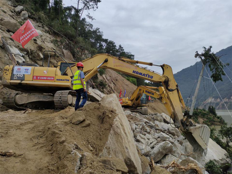 搶險隊伍,馬上出發(fā)!集團(tuán)領(lǐng)導(dǎo)班子立即召開碰頭會,分析研判形勢,安排部署工作,密切關(guān)注震區(qū)態(tài)勢,成立抗震救災(zāi)領(lǐng)導(dǎo)小組,副總經(jīng)理鐘焱宇率現(xiàn)場指揮組趕赴石棉靠前指揮搶險救災(zāi)。正在石棉G108線施工的康藏路橋公司項目部組成10人搶險救援小分隊,攜帶挖掘機(jī)4臺、拖車4臺、裝載機(jī)3臺、交通運輸車2輛、無人機(jī)1臺,第一時間到就地?fù)岆U工作,震后7小時,完成國道G108線馬富至菩薩崗約40公里路段、6處塌方點1600余方土石方清理,爾后轉(zhuǎn)戰(zhàn)石棉縣新民鄉(xiāng)進(jìn)行通鄉(xiāng)道路搶通作業(yè)。