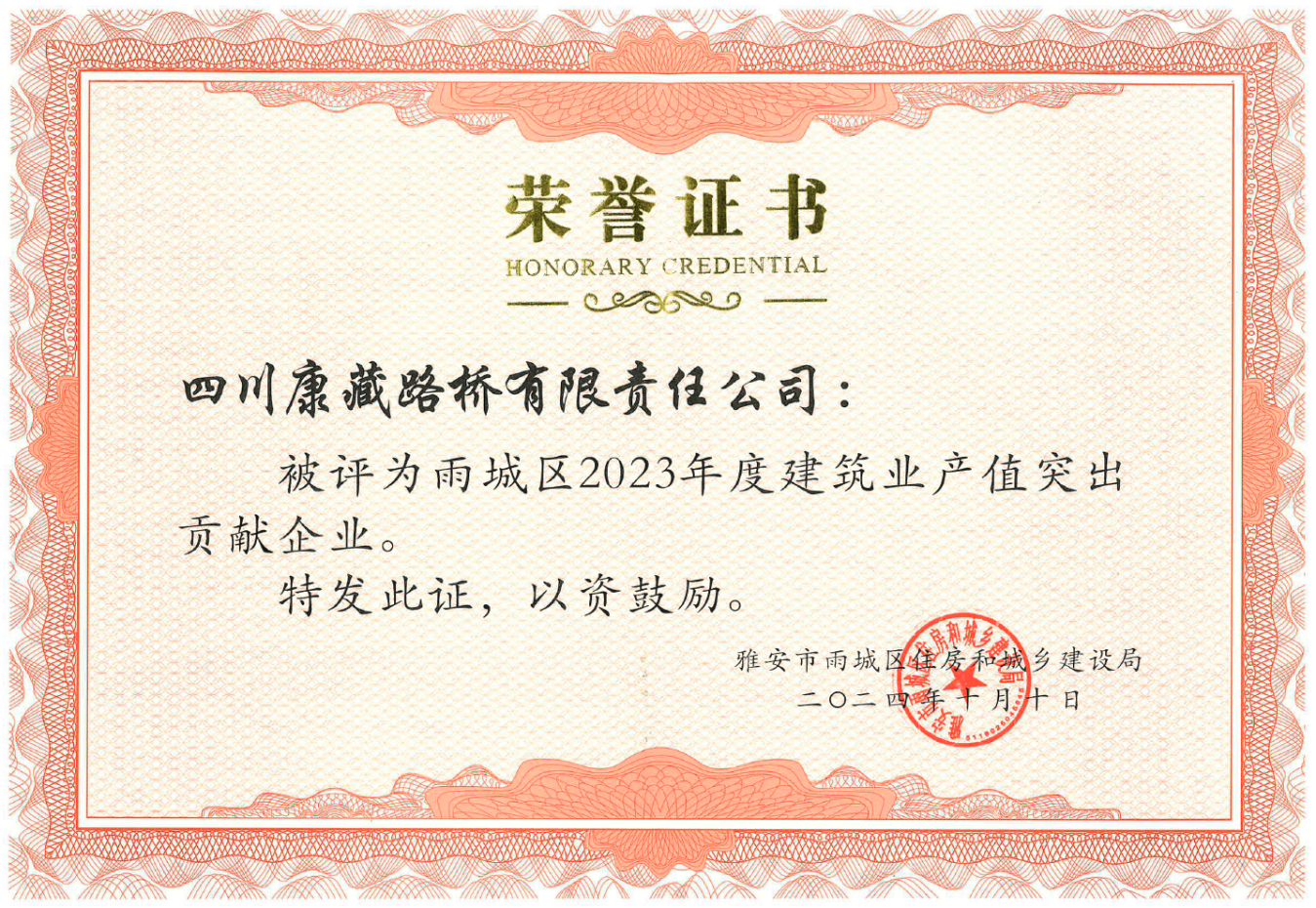 今年10月,路橋公司被雅安市雨城區(qū)住房和城鄉(xiāng)建設局評為“雨城區(qū)2023年度建筑業(yè)產值突出貢獻企業(yè)”。下一步,路橋公司將持續(xù)貫徹落實市委、市政府決策部署,把學習貫徹落實黨的二十大精神與生產經營工作結合起來,發(fā)揮項目引領支撐作用,為地方經濟的發(fā)展持續(xù)貢獻力量。
