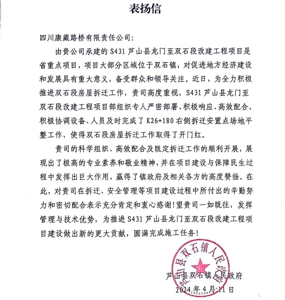近日,雅安交建集團四川康藏路橋有限責任公司收到來自蘆山縣雙石鎮(zhèn)人民政府的表揚信。信中對S431蘆山縣龍門至雙石段改建工程項目部積極協(xié)調(diào)設備、人員配合當?shù)卣瓿蒏26+180右側(cè)拆遷安置點場地平整工作,使得雙石段房屋拆遷工作取得了開門紅給予了高度評價和贊揚。