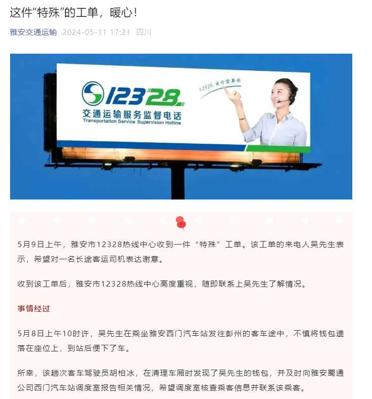 5月8日上午,乘客吳先生在乘坐蜀通公司客車時,不慎將錢包遺落在座位上。司機胡柏冰在清理車廂衛(wèi)生時發(fā)現(xiàn)了這個錢包,他立即向蜀通公司西門車站調(diào)度室匯報,并在調(diào)度室的協(xié)助下,吳先生成功取回了自己的錢包。雅安市12328熱線中心在接到吳先生的反饋后,對蜀通公司的服務(wù)和司機胡柏冰的善舉給予了高度評價,并通過雅安交通局公眾號進行了宣傳表揚。