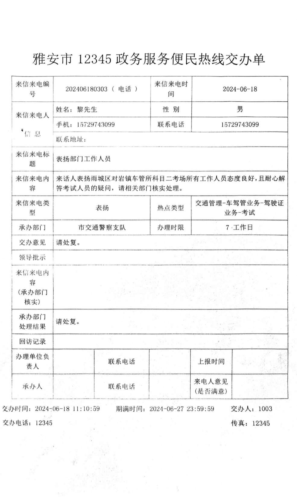 2024年6月18日,平順公司收到一封特殊的來信,市民黎先生通過“12345”政務服務便民熱線“...表揚科目二考場所有工作人員態(tài)度良好,且耐心解答考試人員的疑問...”。字里行間表達了對我公司科目二所有工作人員工作的滿意和認可。