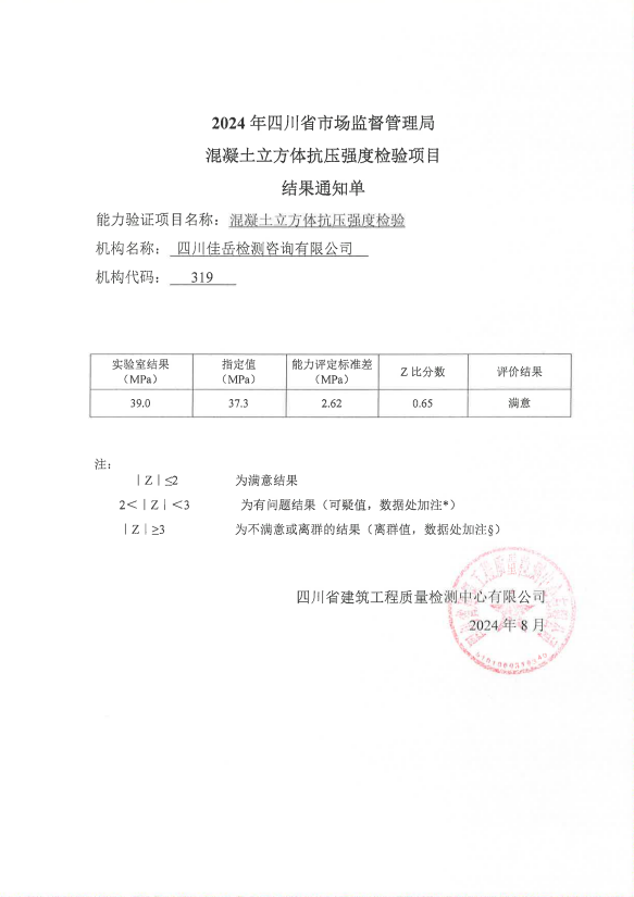 喜訊!四川佳岳檢測咨詢有限公司(簡稱:佳岳公司)在2024年度四川省市場監(jiān)督管理局組織的檢驗(yàn)檢測機(jī)構(gòu)能力驗(yàn)證項(xiàng)目中,參與的“混凝土立方體抗壓強(qiáng)度檢驗(yàn)”項(xiàng)目獲得“滿意”評價。