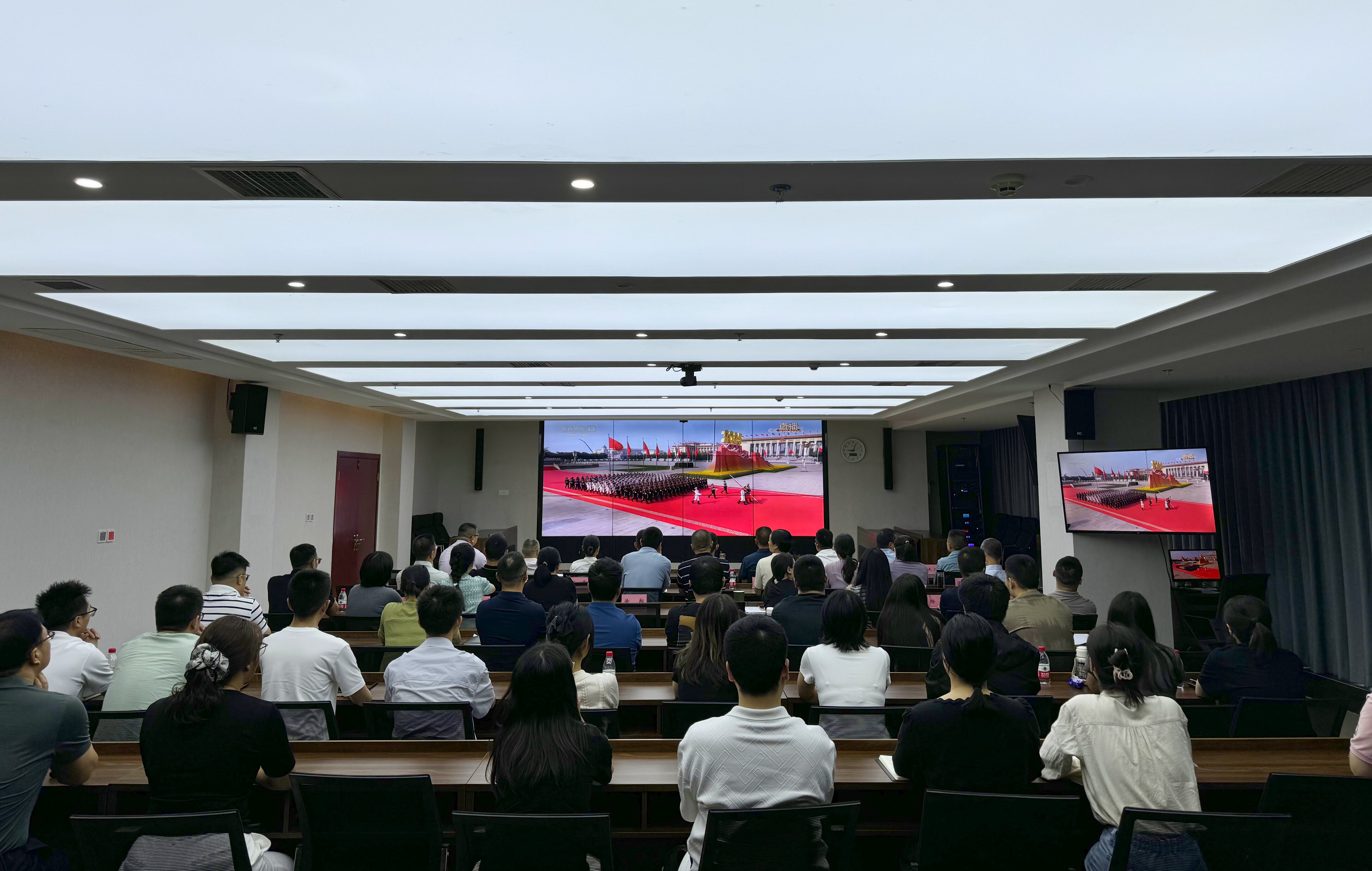 在集團(tuán)機關(guān)會議室,干部職工神情莊重,通過高清投影實時觀看紀(jì)念大會直播,從莊嚴(yán)肅穆的紀(jì)念儀式到振奮人心的重要講話,每一個環(huán)節(jié)都讓在場人員深受震撼。與此同時,集團(tuán)下屬子公司分別在項目指揮部、客運場站、物流園區(qū)等場所組織集中觀看,確保一線員工同步參與學(xué)習(xí)。在國道318線改建工程項目部現(xiàn)場,建設(shè)者們在工地臨時會議室集中收看,斑駁的工裝與鮮紅的黨旗交相輝映,成為現(xiàn)場最鮮明的印記。