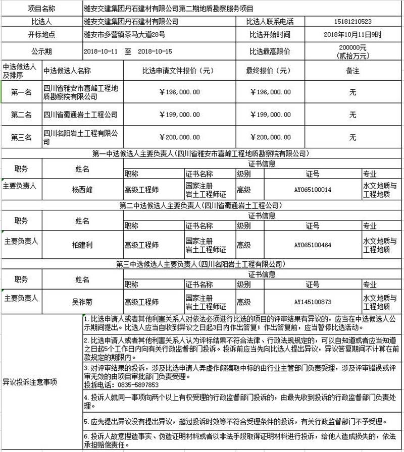 雅安交建集團丹石建材有限公司第二期地質(zhì)勘察服務(wù)項目比選公示