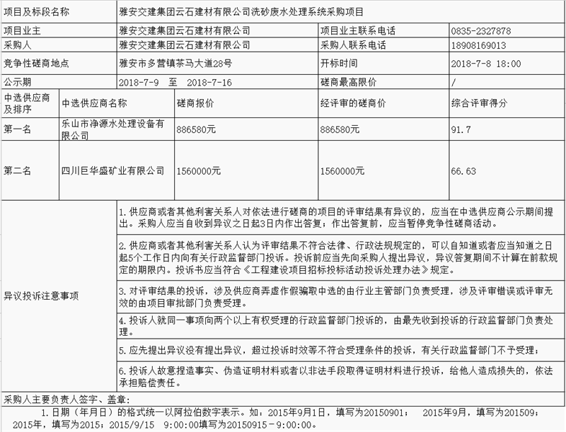 雅安交建集團云石建材有限公司洗砂廢水處理系統(tǒng)采購項目中選供應(yīng)商公示