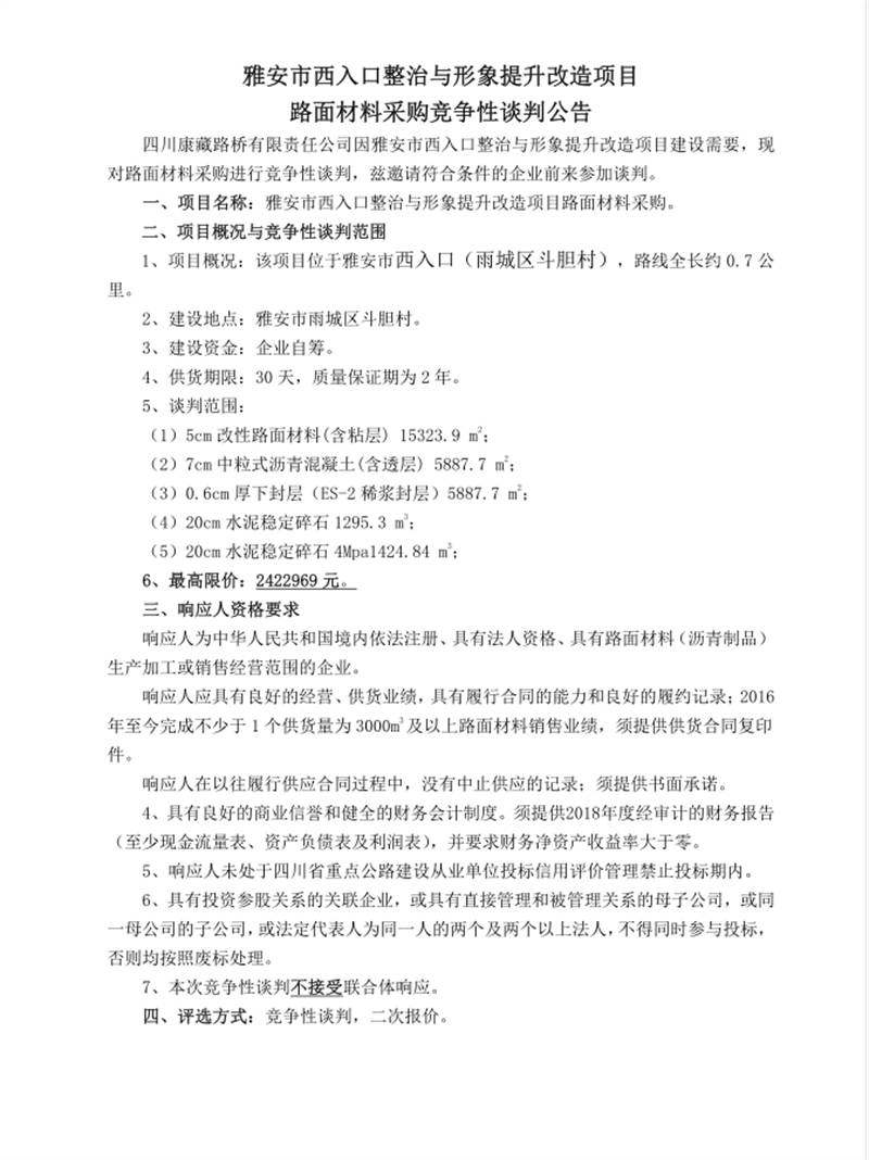 雅安市西入口整治與形象提升改造項目路面材料采購競爭性談判公告