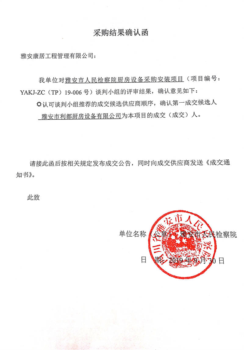 雅安市人民檢察院廚房設(shè)備采購安裝項目采購結(jié)果公示