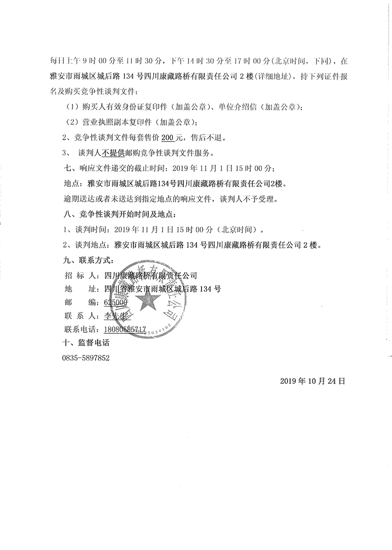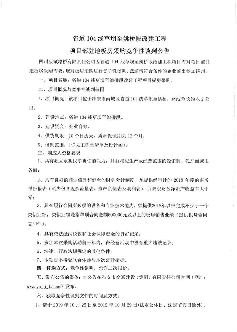 四川康藏路橋有限責(zé)任公司省道104線草壩至姚橋段改建工程項(xiàng)目部駐地板房采購(gòu)競(jìng)爭(zhēng)性談判公告
