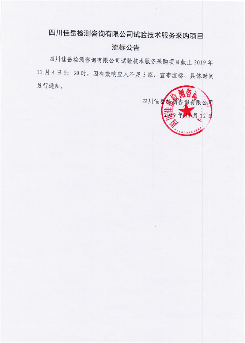 四川佳岳檢測(cè)咨詢有限公司試驗(yàn)技術(shù)服務(wù)采購項(xiàng)目流標(biāo)公告
