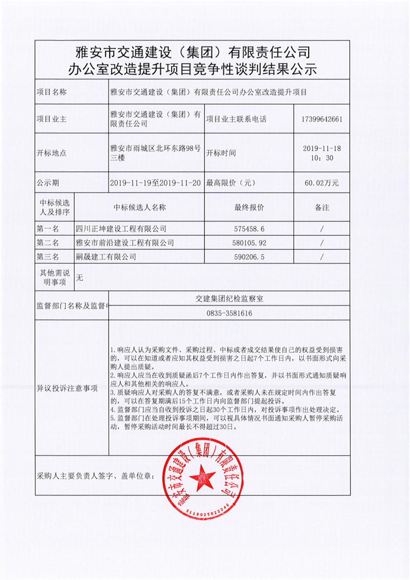 雅安市交通建設(shè)(集團)有限責(zé)任公司辦公室改造提升項目競爭性談判結(jié)果公示