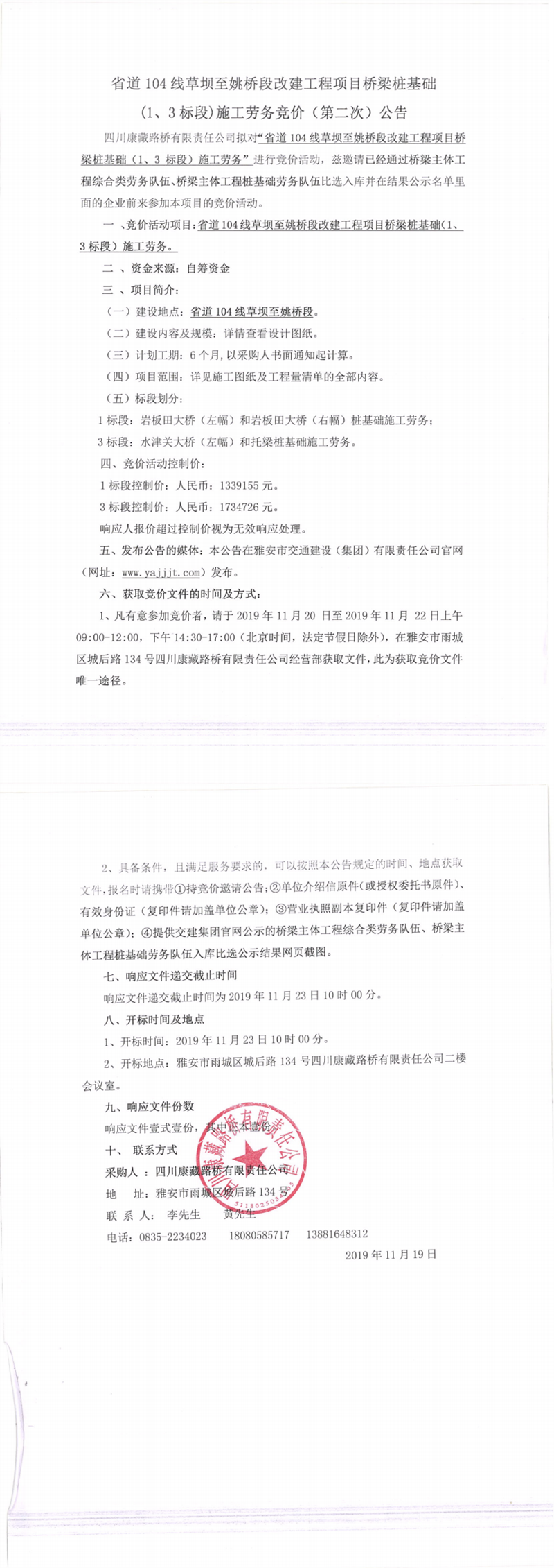 四川康藏路橋有限責(zé)任公司省道104線草壩至姚橋段改建工程項目橋梁樁基礎(chǔ)(1、3標段)施工勞務(wù)競價(第二次)公告