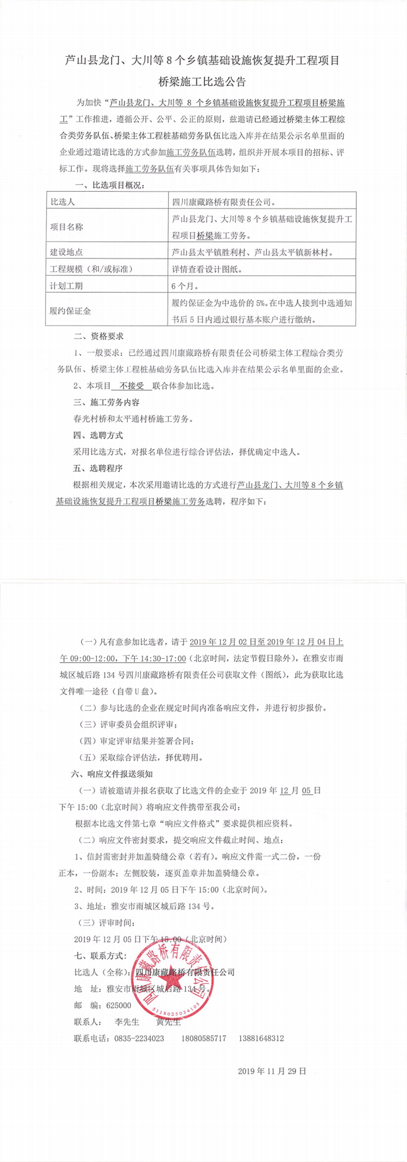四川康藏路橋有限責(zé)任公司蘆山縣龍門、大川等8個(gè)鄉(xiāng)鎮(zhèn)基礎(chǔ)設(shè)施恢復(fù)提升工程項(xiàng)目施工勞務(wù)競(jìng)價(jià)結(jié)果公示