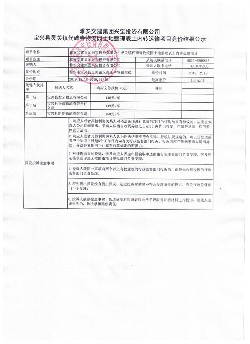 雅安交建集團興寶投資有限公司寶興縣靈關鎮(zhèn)代碑寺物流園土地整理表土內(nèi)轉(zhuǎn)運輸項目競價結果公示
