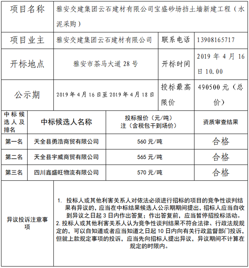 寶盛砂場擋土墻新建工程(水泥采購)項目競爭性談判結(jié)果公示