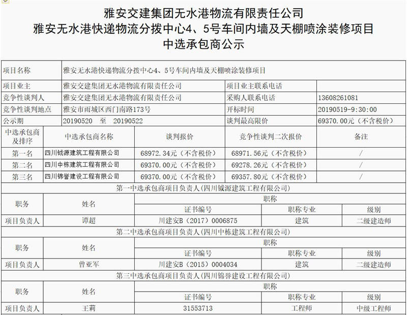 雅安無水港快遞物流分撥中心4、5號(hào)車間內(nèi)墻及天棚噴涂裝修項(xiàng)目中選承包商公示