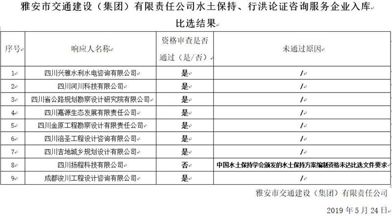 雅安市交通建設(集團)有限責任公司水土保持、行洪論證咨詢服務企業(yè)入庫比選結(jié)果公示
