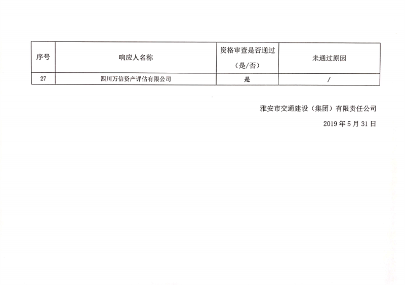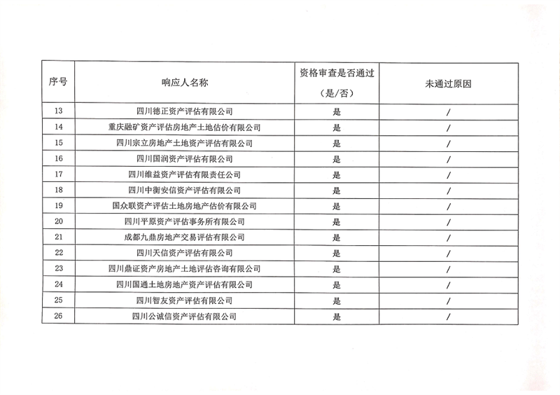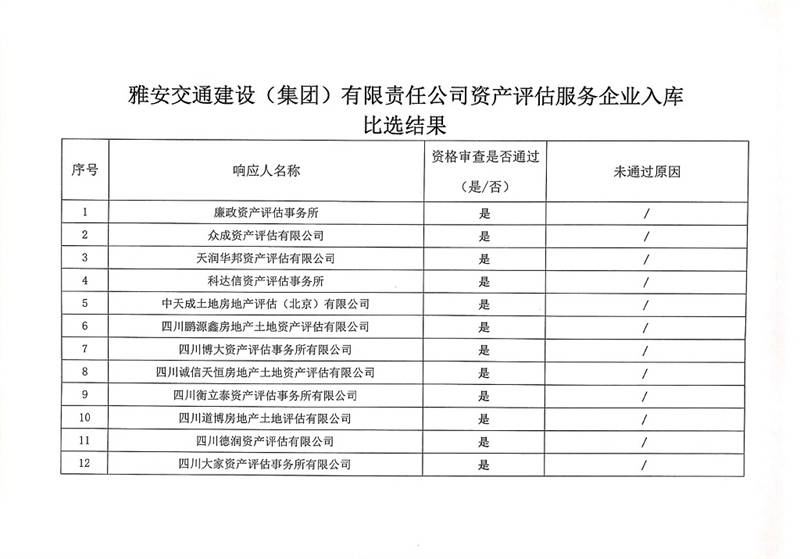 雅安交通建設(shè)(集團(tuán))有限責(zé)任公司資產(chǎn)評(píng)估服務(wù)企業(yè)入庫(kù)比選結(jié)果