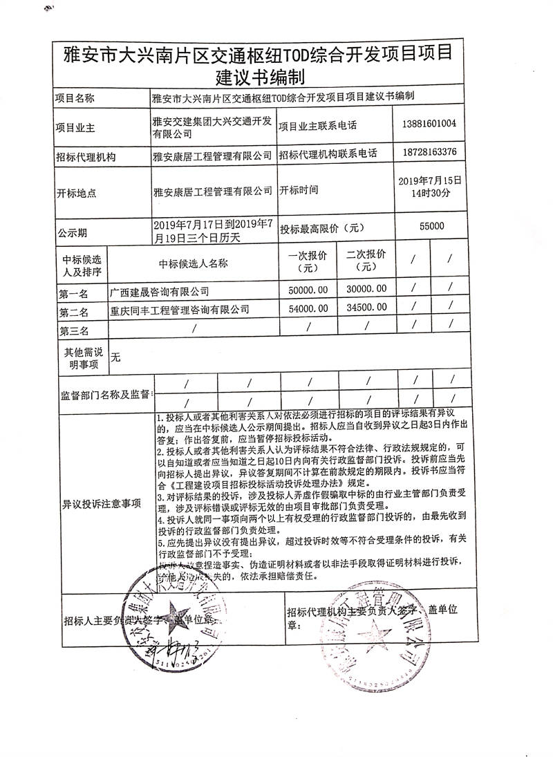 雅安交建集團(tuán)大興交通開發(fā)有限公司雅安市大興南片區(qū)交通樞紐TOD綜合開發(fā)項目項目建議書編制競爭性談判結(jié)果公示