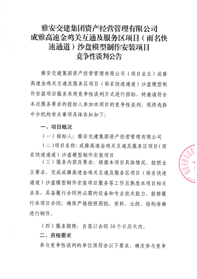 雅安交建集團資產(chǎn)經(jīng)營管理有限公司成雅高速金雞關(guān)互通及服務(wù)區(qū)項目(雨名快速通道)沙盤模型制作安裝項目競爭性談判公告