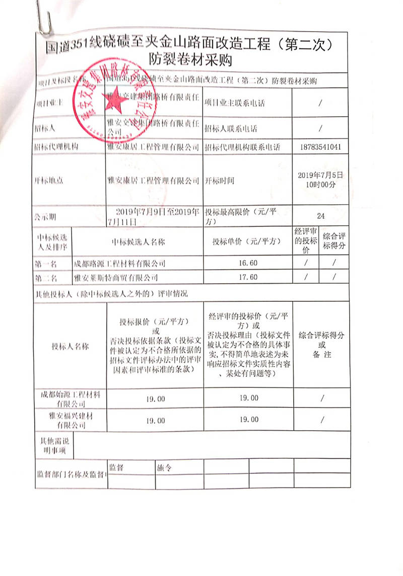 雅安交建集團(tuán)路橋有限責(zé)任公司國(guó)道351線磽磧至夾金山路面改造工程(第二次)防裂卷材采購競(jìng)爭(zhēng)性談判結(jié)果公示