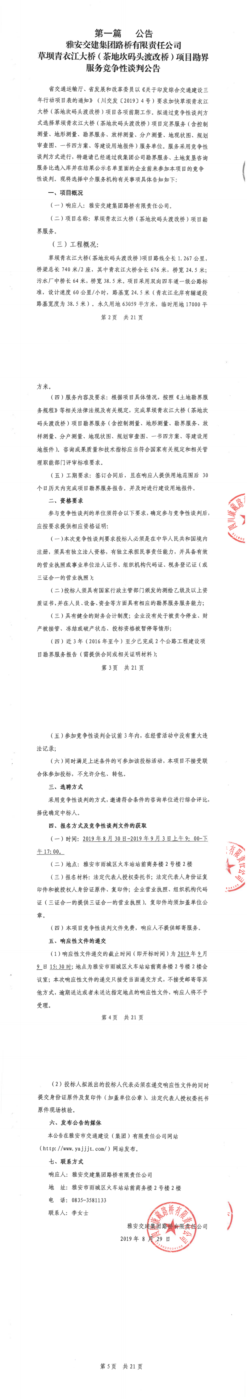 雅安交建集團路橋有限責任公司草壩青衣江大橋(茶地坎碼頭渡改橋)項目勘界服務(wù)競爭性談判公告