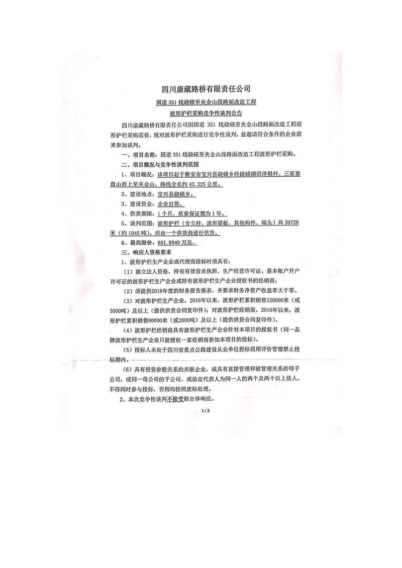 四川康藏路橋有限責(zé)任公司國道351線磽磧至夾金山段路面改造工程波形護(hù)欄采購競(jìng)爭(zhēng)性談判公告