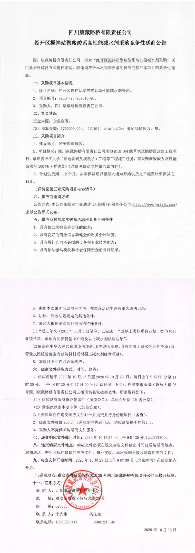四川康藏路橋有限責(zé)任公司經(jīng)開(kāi)區(qū)攪拌站聚羧酸系高性能減水劑采購(gòu)競(jìng)爭(zhēng)性磋商公告