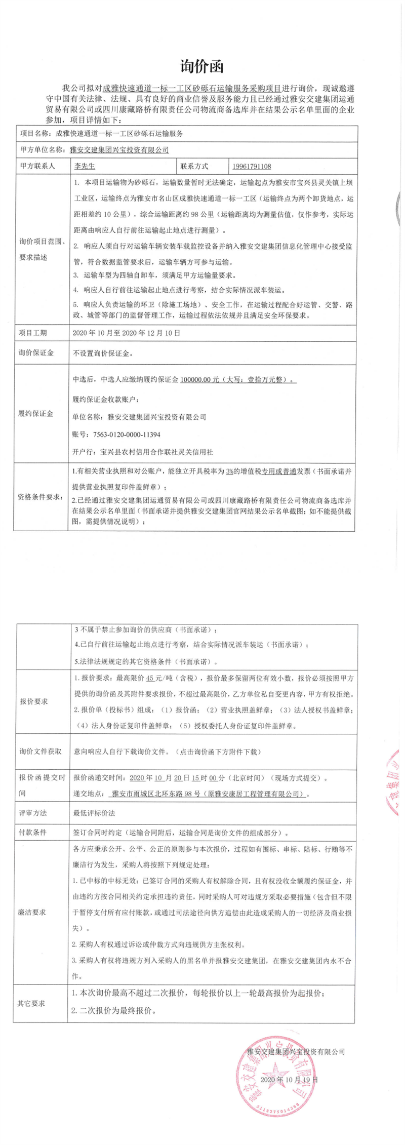雅安交建集團興寶投資有限公司成雅快速通道一標(biāo)一工區(qū)砂礫石運輸服務(wù)采購項目詢價函