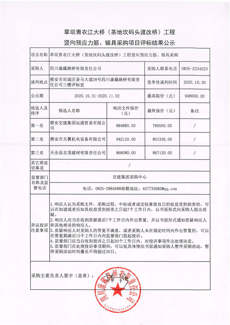 四川康藏路橋有限責(zé)任公司草壩青衣江大橋(茶地坎碼頭渡改橋)工程豎向預(yù)應(yīng)力筋、錨具采購項(xiàng)目評(píng)標(biāo)結(jié)果公示