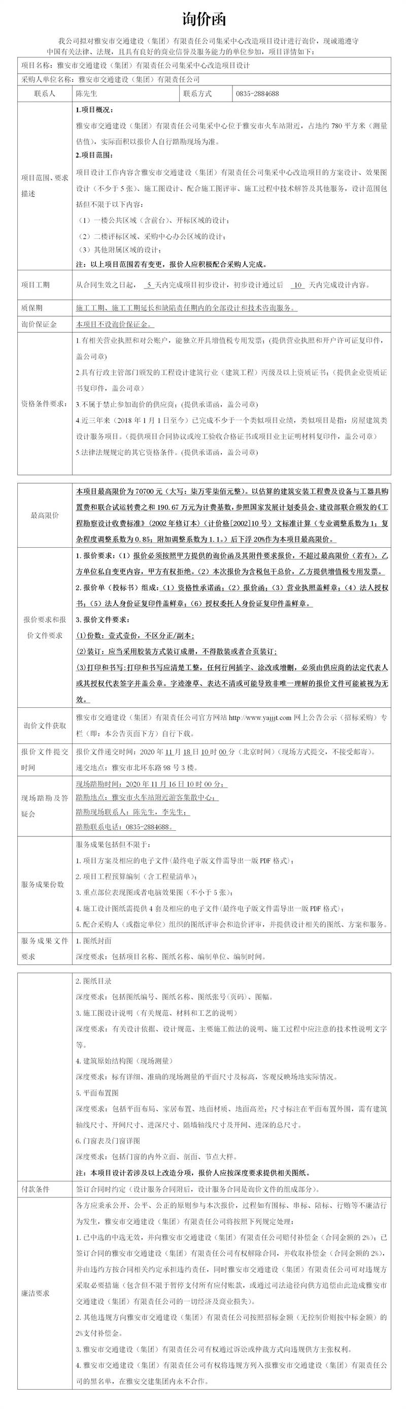 雅安市交通建設(shè)(集團(tuán))有限責(zé)任公司集采中心改造項目設(shè)計詢價公告