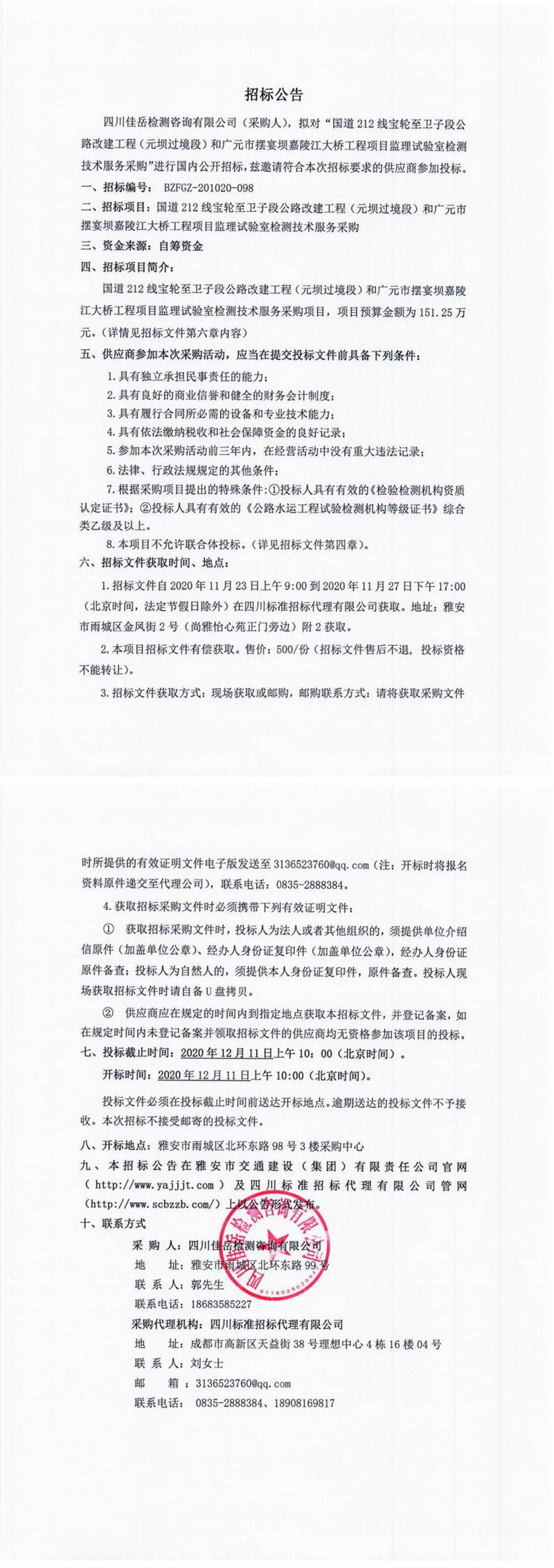 四川佳岳檢測咨詢有限公司國道212線寶輪至衛(wèi)子段公路改建工程(元壩過境段)和廣元市擺宴壩嘉陵江大橋工程項目監(jiān)理試驗室檢測技術(shù)服務(wù)采購招標公告