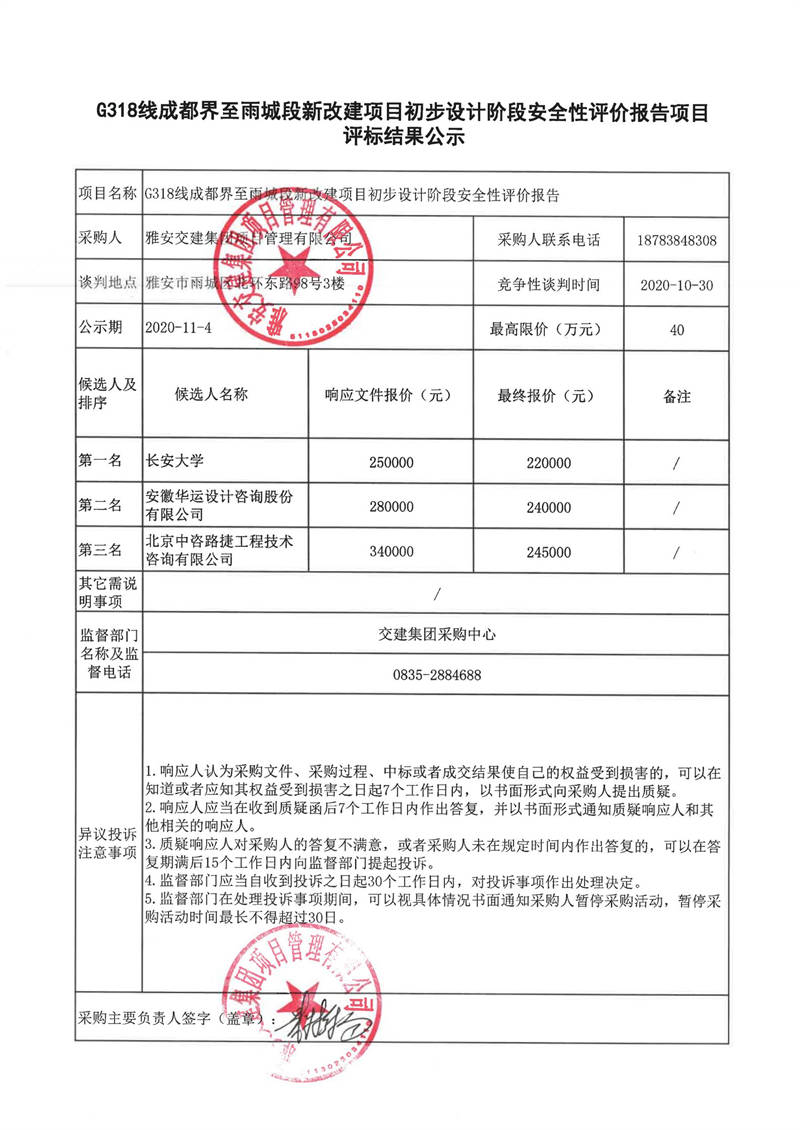 雅安交建集團項目管理有限公司G318線成都界至雨城段新改建項目初步設計階段安全性評價報告項目評標結(jié)果公示