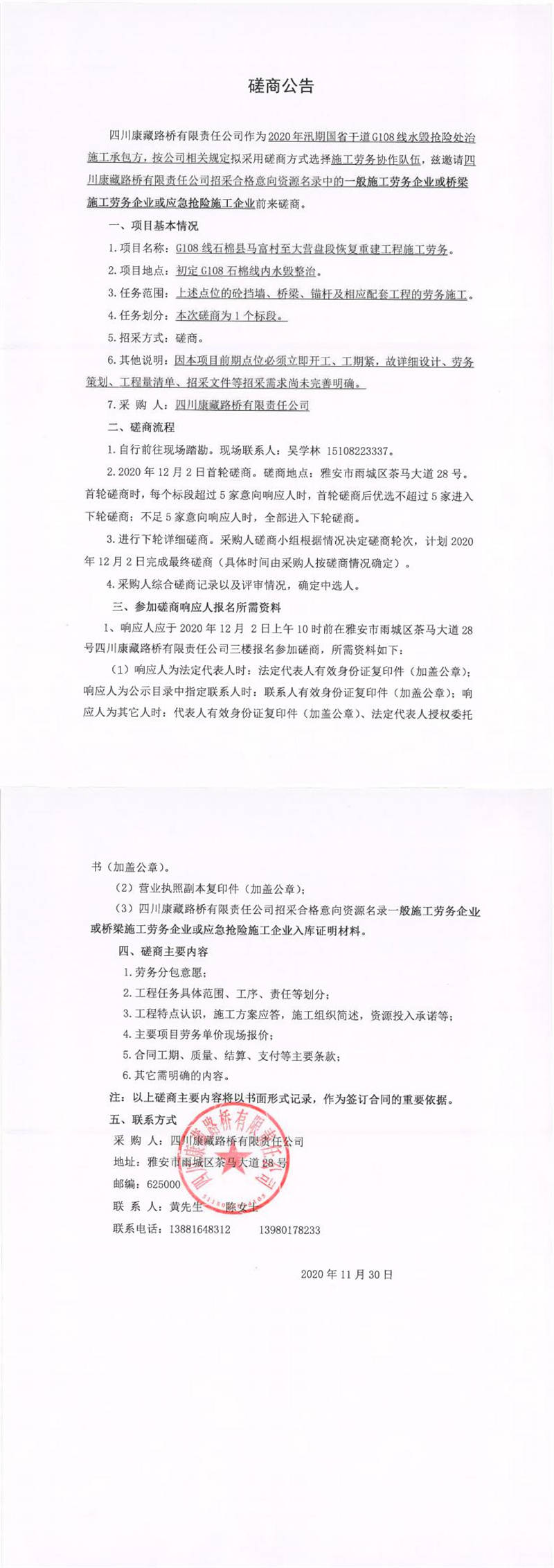 四川康藏路橋有限責(zé)任公司G108線石棉縣馬富村至大營盤段恢復(fù)重建工程施工勞務(wù)磋商公告
