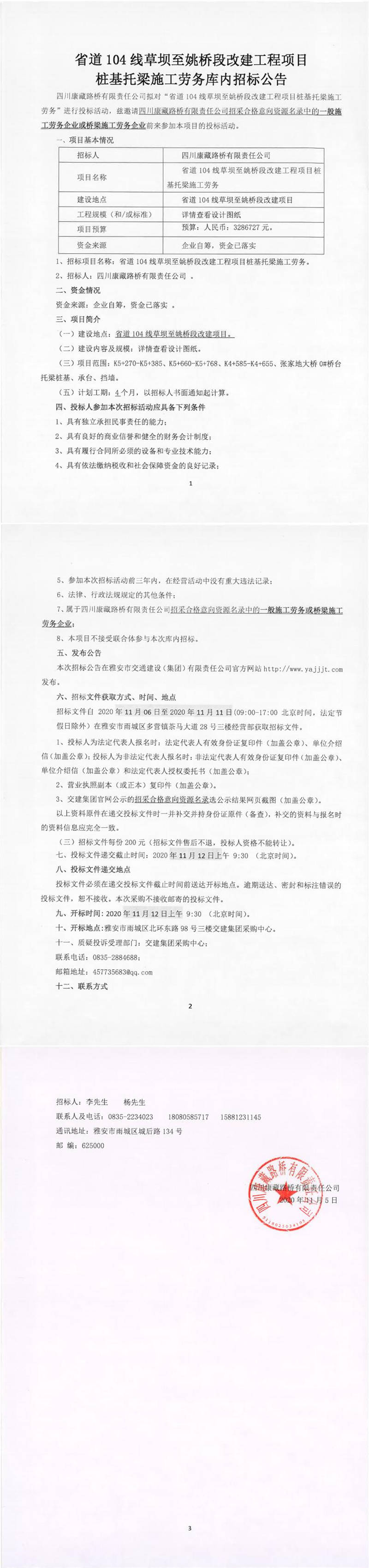 四川康藏路橋有限責任公司省道104線草壩至姚橋段改建工程項目樁基托梁施工勞務(wù)庫內(nèi)招標公告