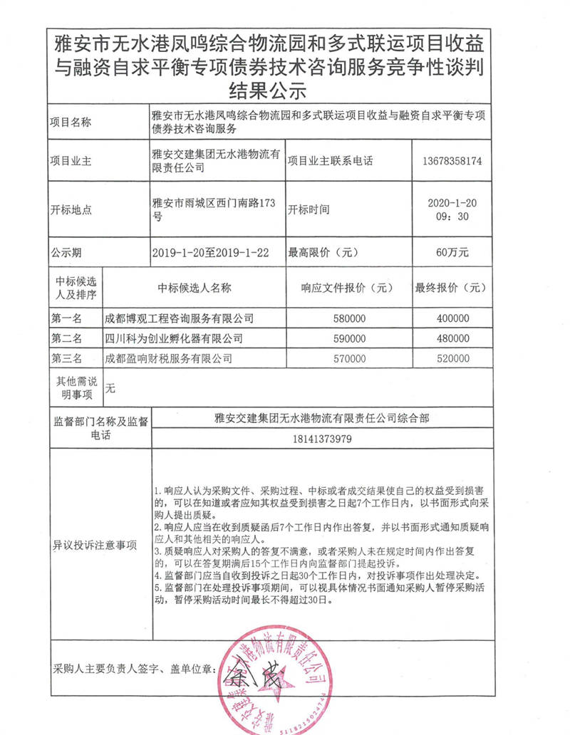 雅安市無水港鳳鳴綜合物流園和多式聯(lián)運(yùn)項(xiàng)目收益與融資自求平衡專項(xiàng)債券技術(shù)咨詢服務(wù)競爭性談判結(jié)果公示