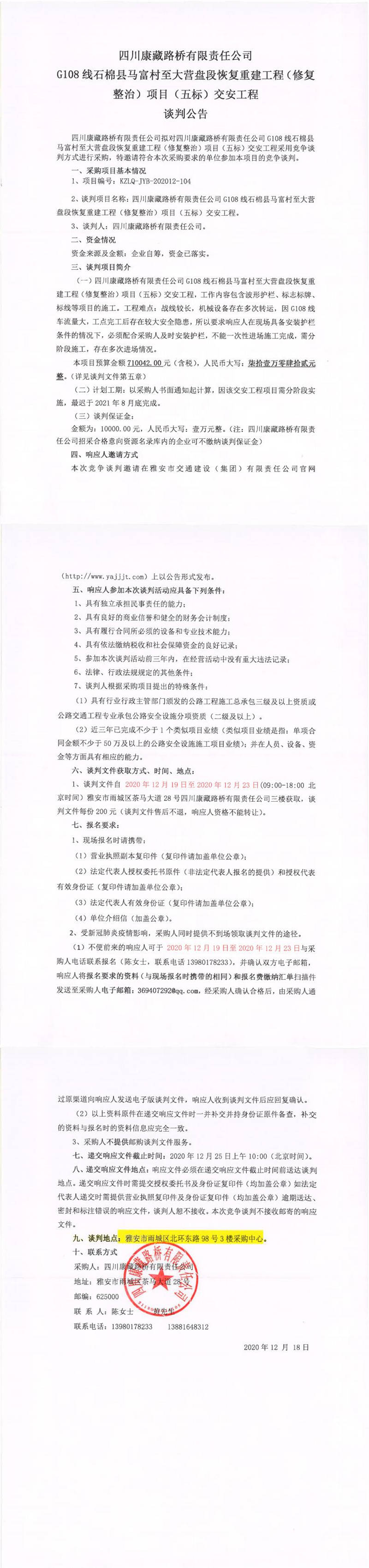 四川康藏路橋有限責任公司G108線石棉縣馬富村至大營盤段恢復(fù)重建工程(修復(fù)整治)項目(五標)交安工程談判公告