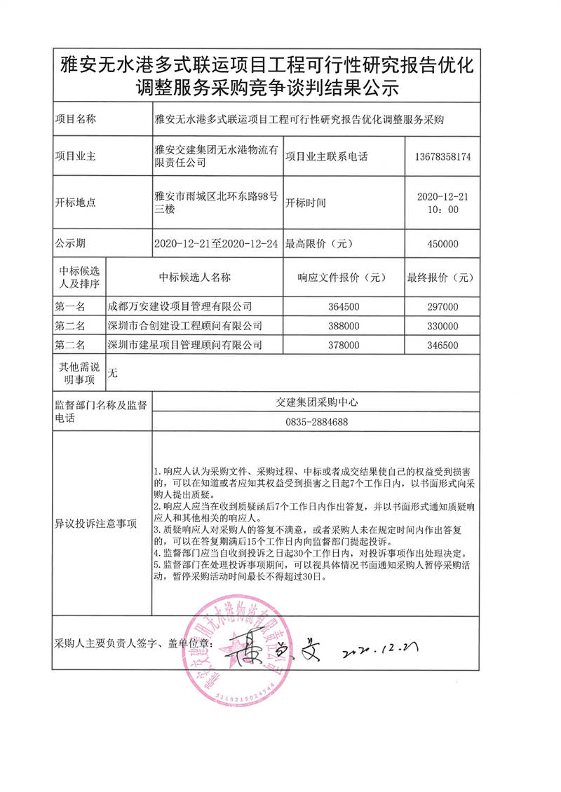 雅安交建集團無水港物流有限責任公司雅安無水港多式聯(lián)運項目工程可行性研究報告優(yōu)化調整服務采購競爭談判結果公示