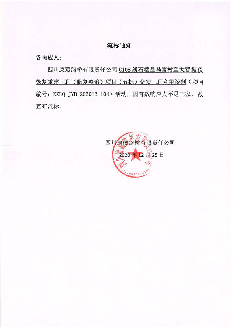 四川康藏路橋有限責(zé)任公司G108線石棉縣馬富村至大營盤段恢復(fù)重建工程(修復(fù)整治)項目(五標(biāo))交安工程流標(biāo)通知
