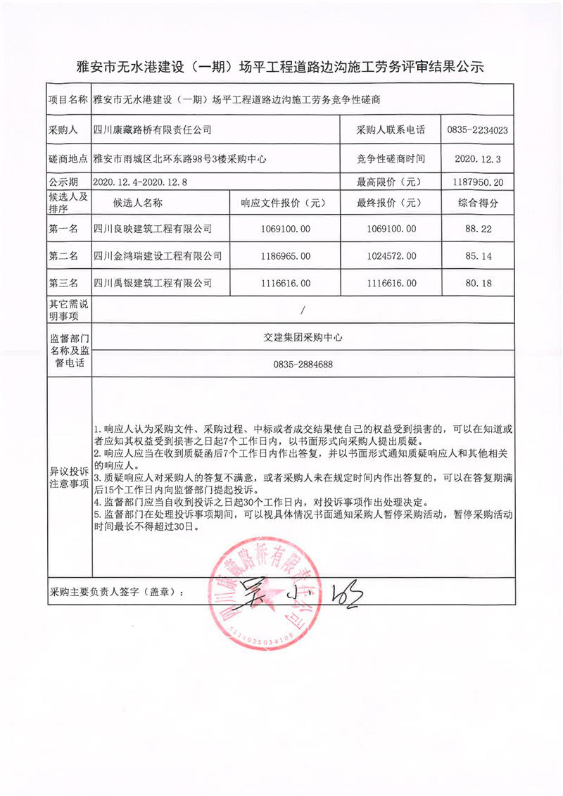 四川康藏路橋有限責(zé)任公司雅安市無(wú)水港建設(shè)(一期)場(chǎng)平工程道路邊溝施工勞務(wù)評(píng)審結(jié)果公示