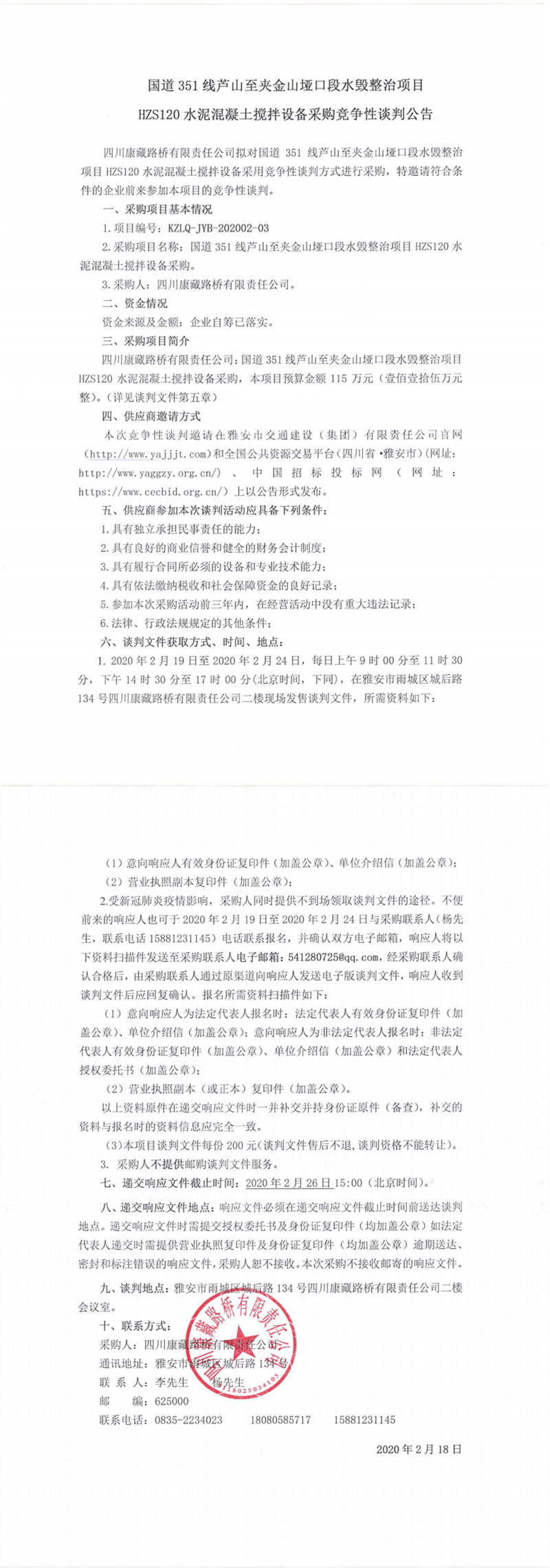 四川康藏路橋有限責(zé)任公司國道351線蘆山至夾金山埡口段水毀整治項(xiàng)目 HZS120水泥混凝土攪拌設(shè)備采購競爭性談判公告