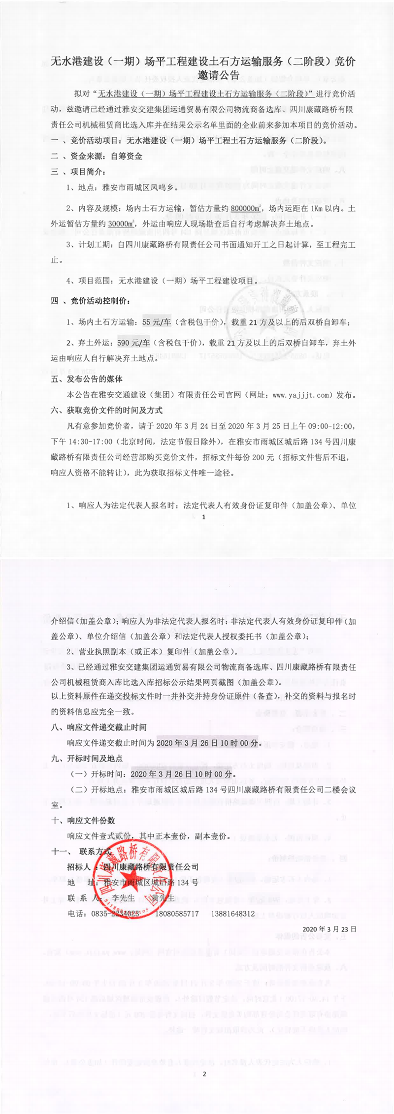 四川康藏路橋有限責任公司無水港建設(shè)(一期)場平工程建設(shè)土石方運輸服務(wù)(二階段)競價邀請公告