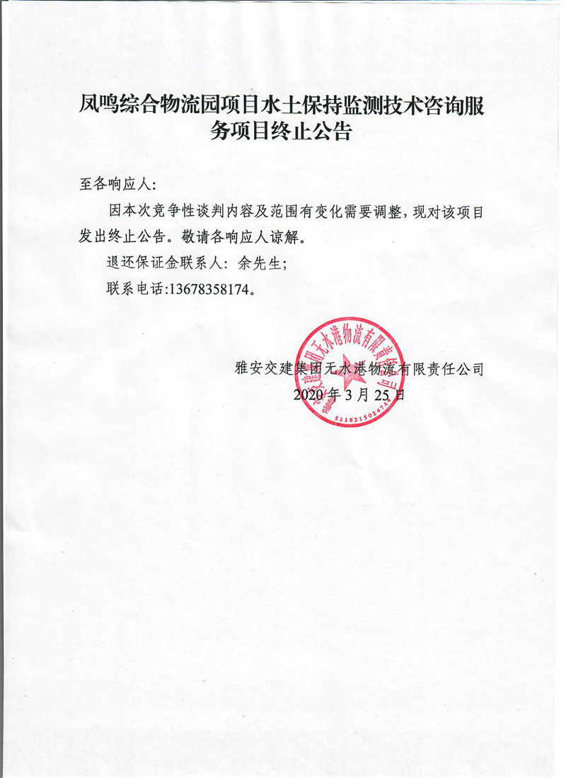 雅安交建集團(tuán)無水港物流有限責(zé)任公司鳳鳴綜合物流園項(xiàng)目水土保持監(jiān)測(cè)技術(shù)咨詢服務(wù)項(xiàng)目終止公告