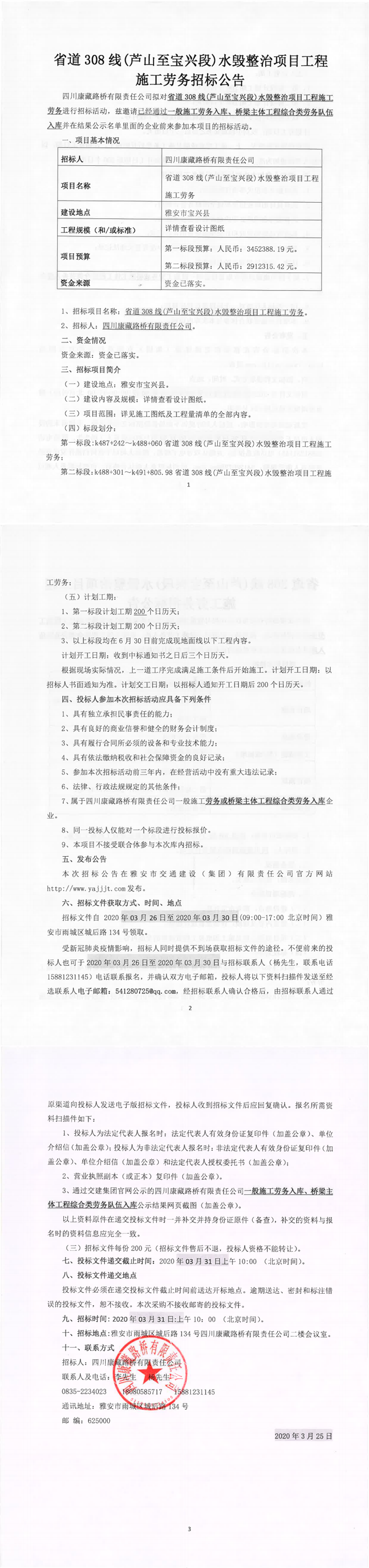 四川康藏路橋有限責任公司省道308線(蘆山至寶興段)水毀整治項目工程施工勞務(wù)招標公告