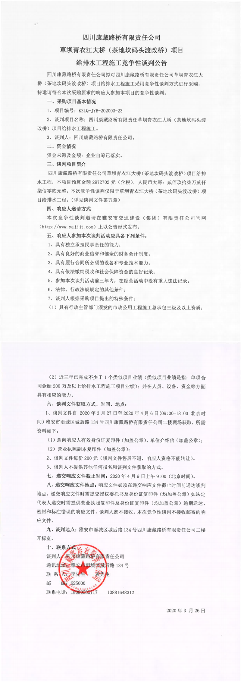四川康藏路橋有限責任公司在建項目草壩青衣江大橋(茶地坎碼頭渡改橋)項目給排水工程施工競爭性談判公告