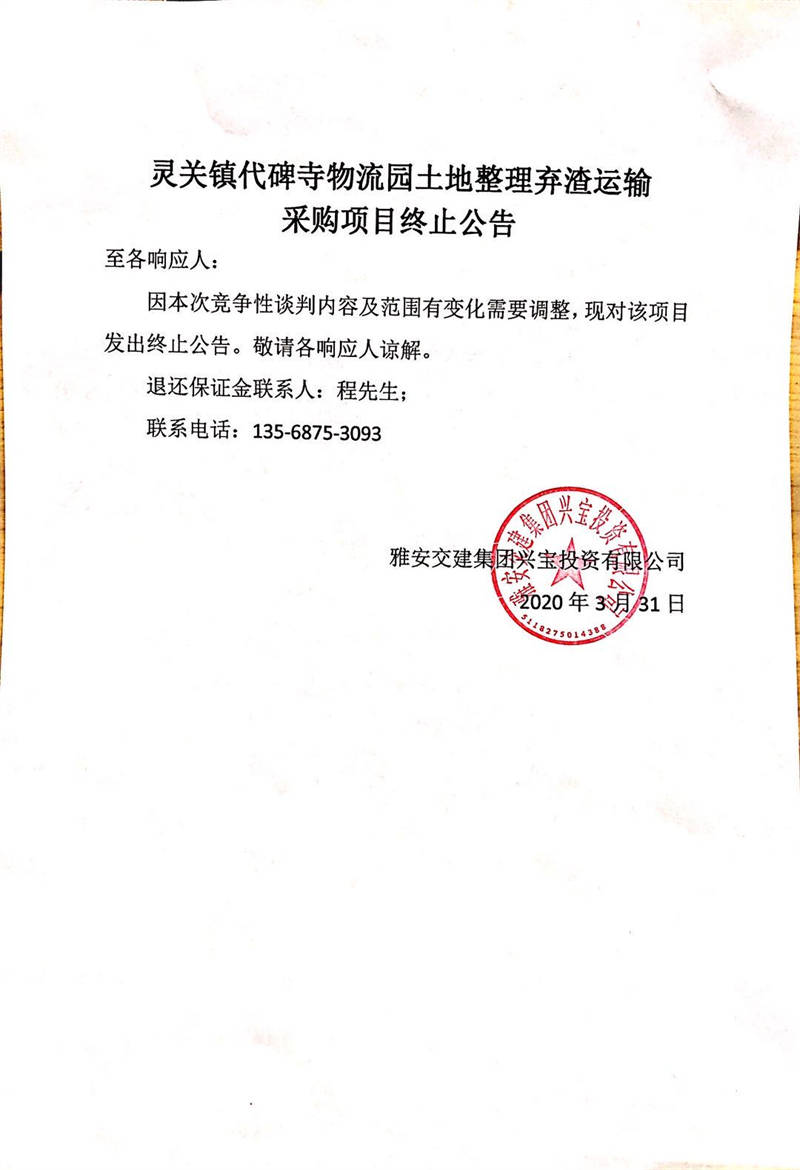 雅安交建集團(tuán)興寶投資有限公司靈關(guān)鎮(zhèn)代碑寺物流園土地整理棄渣運輸采購項目終止公告