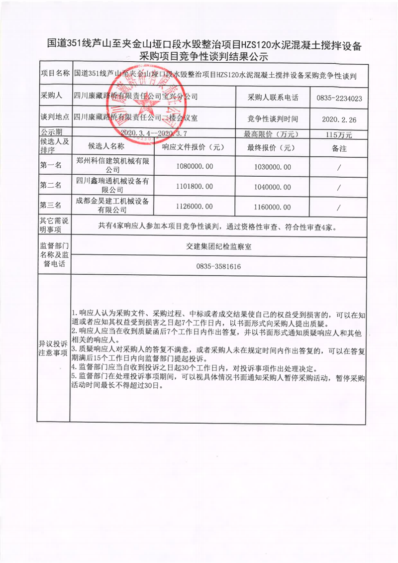 四川康藏路橋有限責任公司國道351線蘆山至夾金山埡口段水毀整治項目在建工程項目HZS120水泥混凝土攪拌設(shè)備采購項目競爭性談判結(jié)果公示
