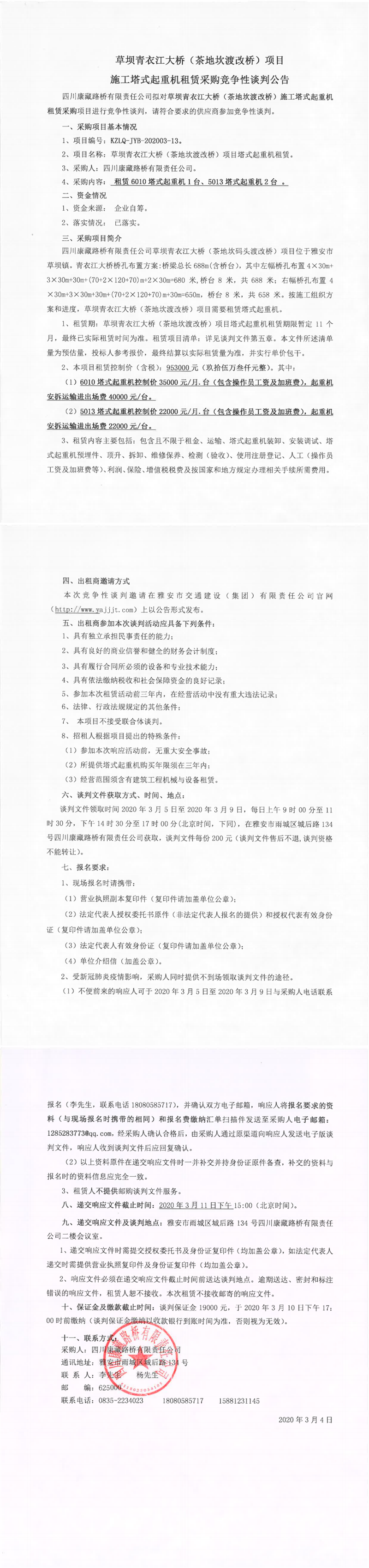 四川康藏路橋有限責(zé)任公司草壩青衣江大橋(茶地坎渡改橋)項(xiàng)目施工塔式起重機(jī)租賃采購競爭性談判公告