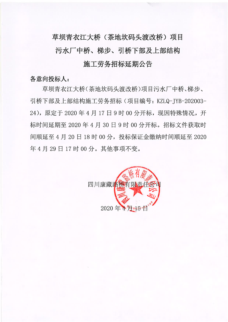 四川康藏路橋有限責(zé)任公司草壩青衣江大橋(茶地坎碼頭渡改橋)項(xiàng)目污水廠中橋、梯步、引橋下部及上部結(jié)構(gòu)施工勞務(wù)招標(biāo)延期公告