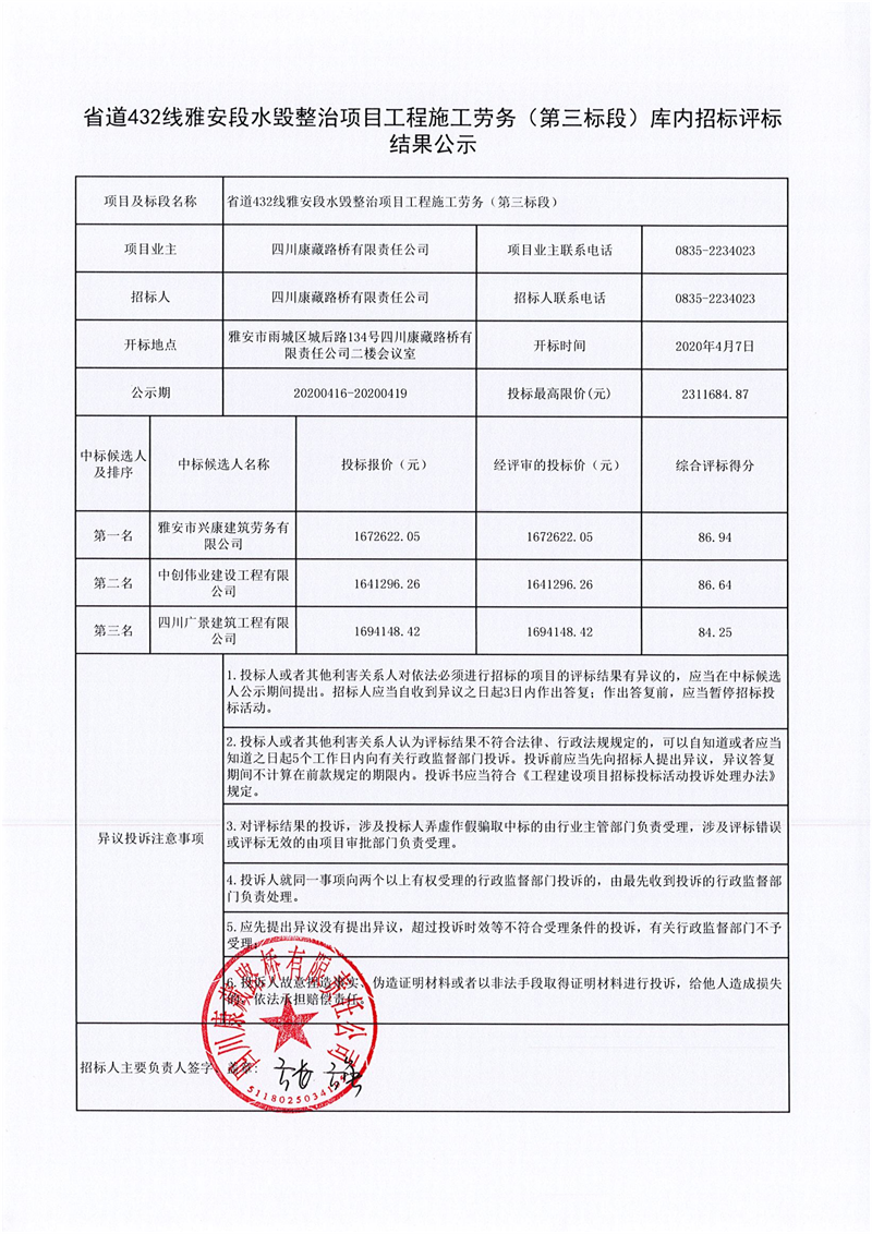 四川康藏路橋有限責(zé)任公司省道432線(xiàn)雅安段水毀整治項(xiàng)目工程施工勞務(wù)(第三標(biāo)段)庫(kù)內(nèi)招標(biāo)評(píng)標(biāo)結(jié)果公示