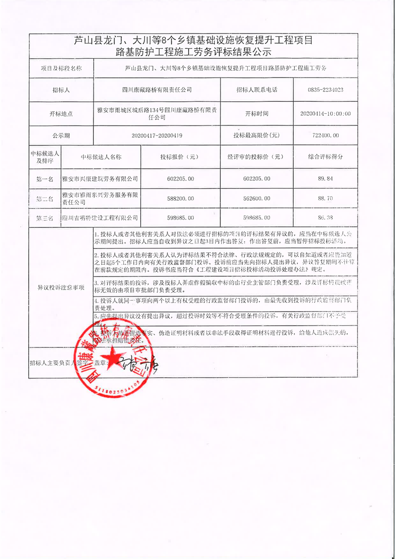 四川康藏路橋有限責(zé)任公司蘆山縣龍門、大川等8個鄉(xiāng)鎮(zhèn)基礎(chǔ)設(shè)施恢復(fù)提升工程項目路基防護工程施工勞務(wù)評標結(jié)果公示